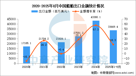 從金額方面來看,數(shù)據(jù)顯示,2025年1-8月中國船舶出口金額33669.4百萬美元,同比增長18.3%。