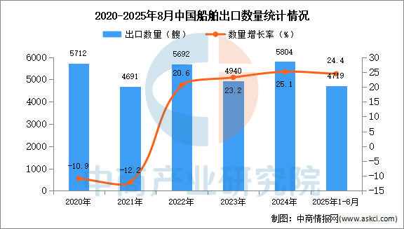中商情報網(wǎng)訊:據(jù)中商產(chǎn)業(yè)研究院數(shù)據(jù)庫顯示,2024年中國船舶進口量5804艘,同比增長25.1%。最新數(shù)據(jù)顯示,2025年1-8月中國船舶出口量4719艘,同比增長24.4%。