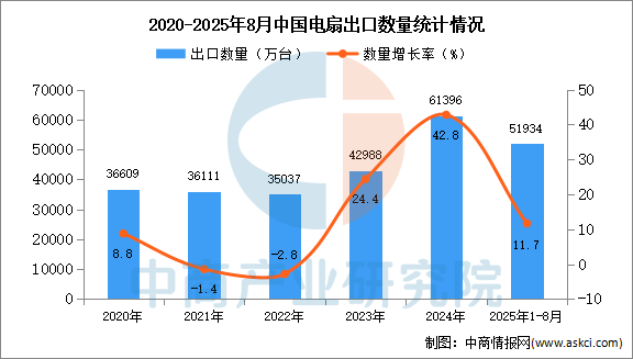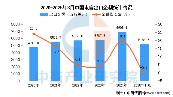 2025年8月中國(guó)電扇出口量及金額增長(zhǎng)情況
