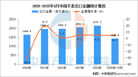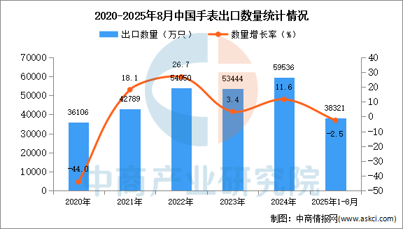 2025年8月中國(guó)手表出口量及金額增長(zhǎng)情況