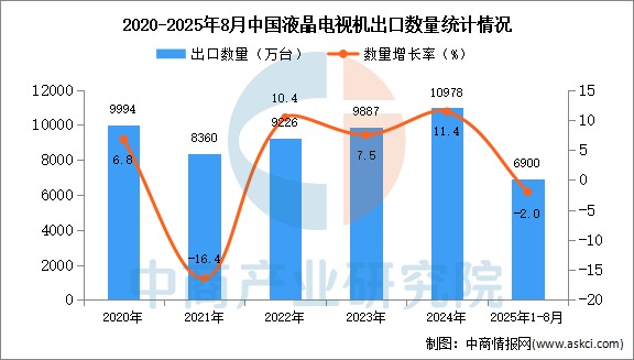 中商情報網(wǎng)訊:據(jù)中商產(chǎn)業(yè)研究院數(shù)據(jù)庫顯示,2024年中國液晶電視機出口量10978萬臺,同比增長11.4%。最新數(shù)據(jù)顯示,2025年1-8月中國液晶電視機出口量6900萬臺,同比下降2%。