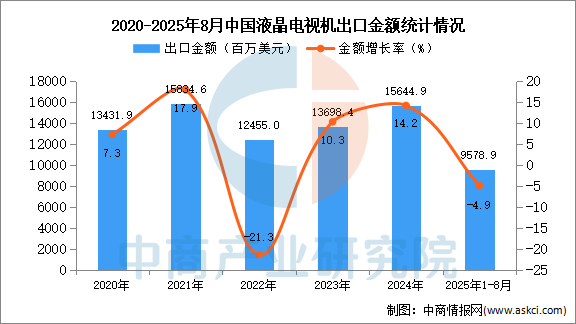 從金額方面來看,數(shù)據(jù)顯示,2025年1-8月中國液晶電視機出口金額9578.9百萬美元,同比下降4.9%。
