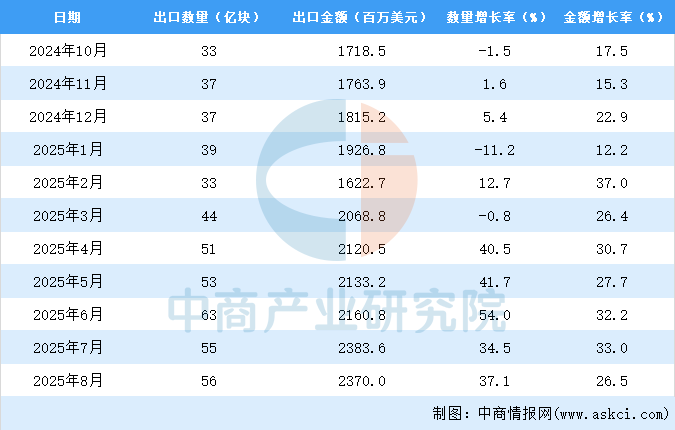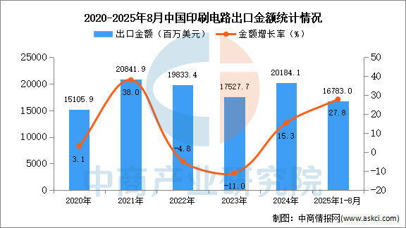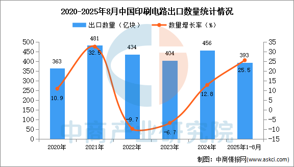 2025年8月中國(guó)印刷電路出口量及金額增長(zhǎng)情況