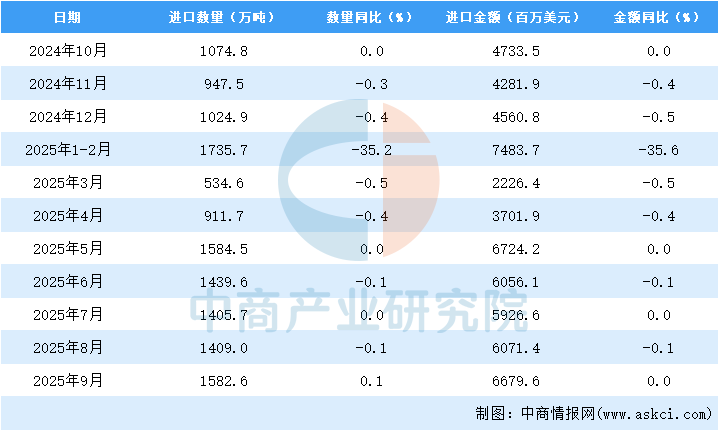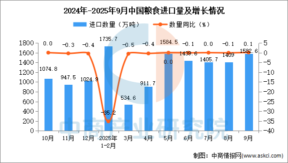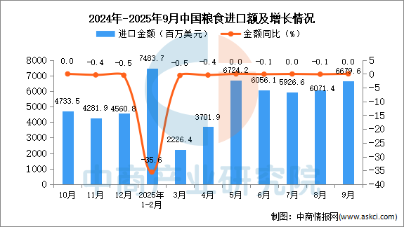 2025年9月中國糧食進(jìn)口量及金額增長情況