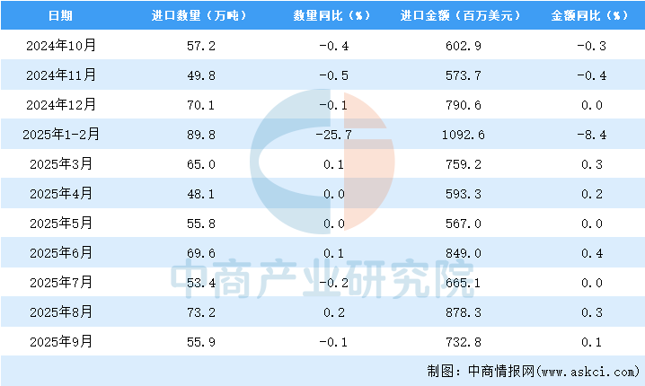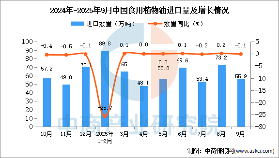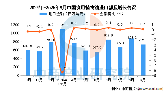 2025年9月中國食用植物油進(jìn)口量及金額增長情況