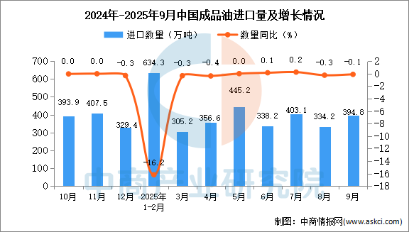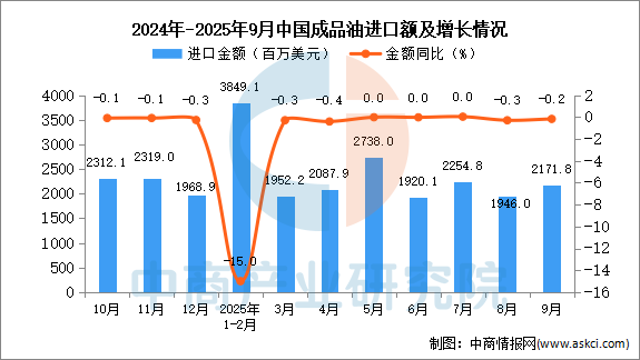 2025年9月中國成品油進(jìn)口量及金額增長情況