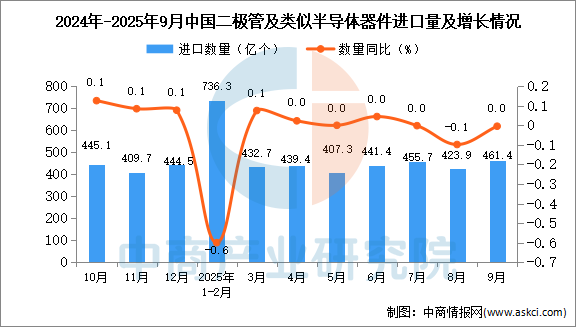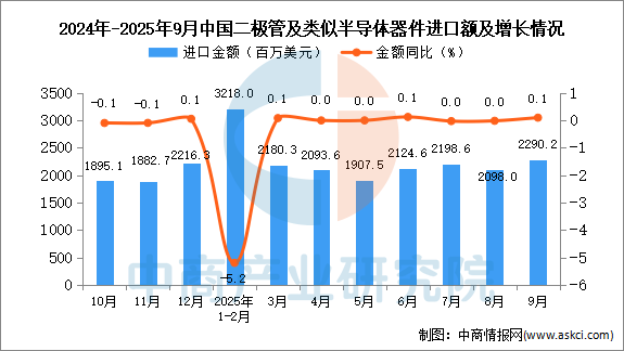 2025年9月中國二極管及類似半導(dǎo)體器件進(jìn)口量及金額增長情況