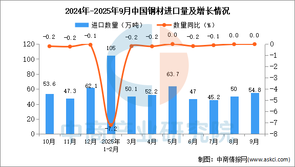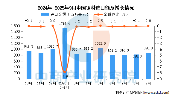 2025年9月中國鋼材進(jìn)口量及金額增長情況