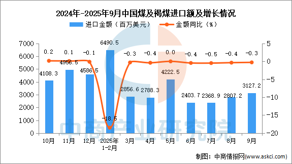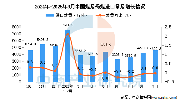 2025年9月中國煤及褐煤進(jìn)口量及金額增長情況