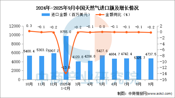 2025年9月中國(guó)天然氣進(jìn)口量及金額增長(zhǎng)情況