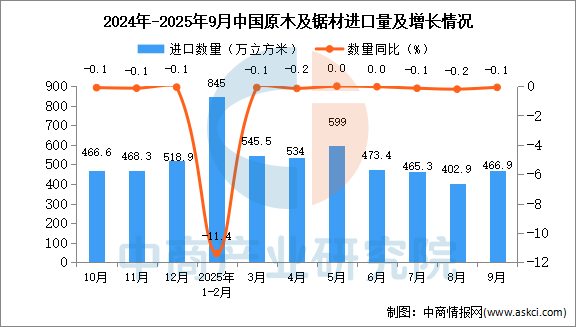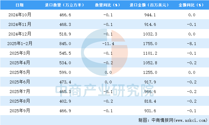 2025年9月中國原木及鋸材進口數據統(tǒng)計分析:進口量466.9萬立方米