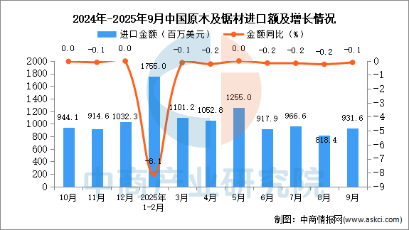 2025年9月中國原木及鋸材進口量及金額增長情況