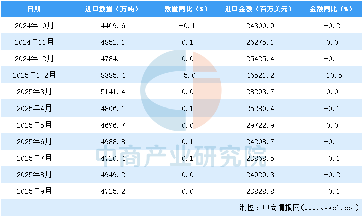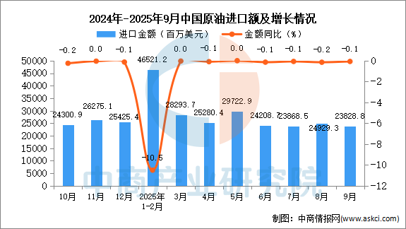 從金額方面來看,2025年9月中國原油進口金額23828.8百萬美元,同比下降0.1%;1-9月中國原油進口金額220896.2百萬美元,同比下降11.2%。