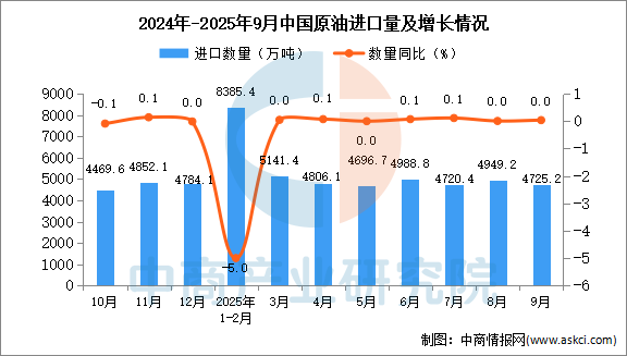 中商情報網訊:據中商產業(yè)研究院數據庫顯示,2025年9月中國原油進口量4725.2萬噸,同比增長持平;1-9月中國原油進口量42299.7萬噸,同比增長2.6%。
