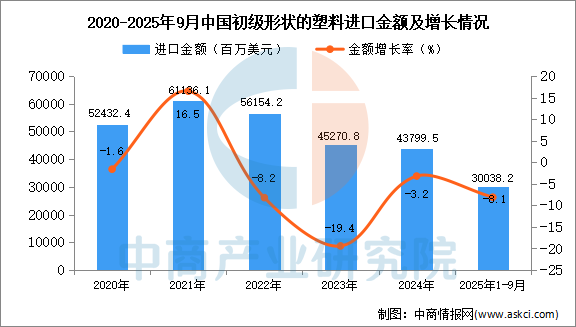 2025年9月中國初級形狀的塑料進(jìn)口量及金額增長情況