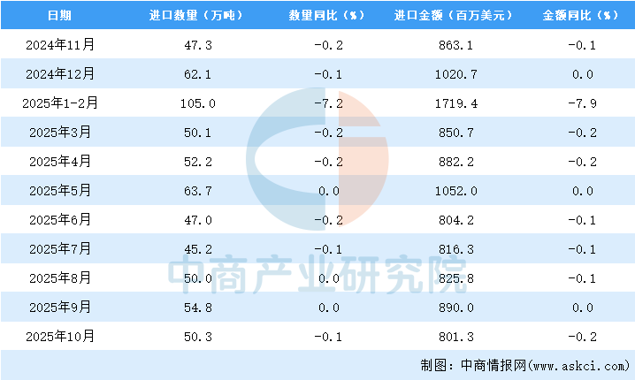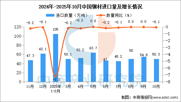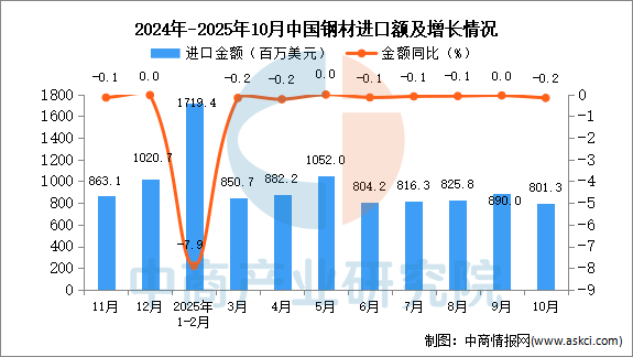 2025年10月中國鋼材進(jìn)口量及金額增長情況