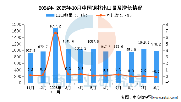 中商情報(bào)網(wǎng)訊:據(jù)中商產(chǎn)業(yè)研究院數(shù)據(jù)庫(kù)顯示,2025年10月中國(guó)鋼材出口量978.2萬(wàn)噸,同比下降0.1;1-10月中國(guó)鋼材出口量9773.7萬(wàn)噸,同比增長(zhǎng)6.6%。