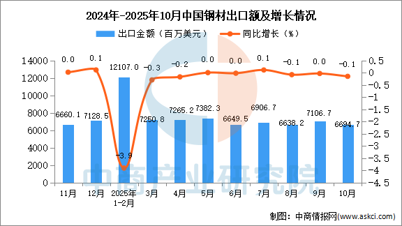 2025年10月中國(guó)鋼材出口量及金額增長(zhǎng)情況