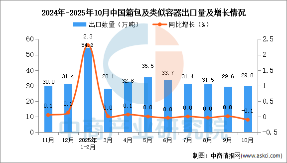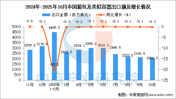 2025年10月中國箱包及類似容器出口量及金額增長情況