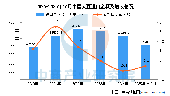 2025年10月中國(guó)大豆進(jìn)口量及金額增長(zhǎng)情況