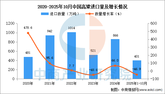 中商情報網(wǎng)訊:據(jù)中商產(chǎn)業(yè)研究院數(shù)據(jù)庫顯示,2024年中國高粱進(jìn)口量866萬噸,同比增長66%。最新數(shù)據(jù)顯示,2025年1-10月中國高粱進(jìn)口量401萬噸,同比下降46.9%。