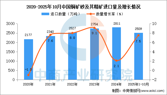 2025年1-10月中國銅礦砂及其精礦進口數(shù)據(jù)統(tǒng)計分析:進口量同比增長7.5%