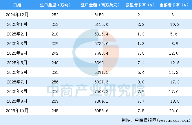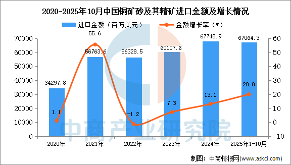 2025年10月中國銅礦砂及其精礦進口量及金額增長情況
