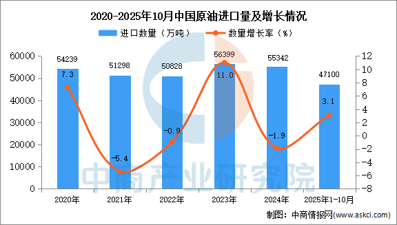 2025年1-10月中國原油進口數(shù)據(jù)統(tǒng)計分析:進口量小幅增長