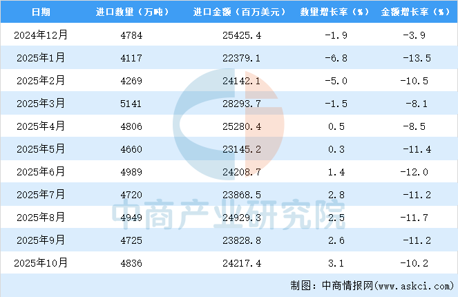 2025年10月中國原油進口量及金額增長情況