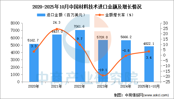 2025年10月中國(guó)材料技術(shù)進(jìn)口量及金額增長(zhǎng)情況