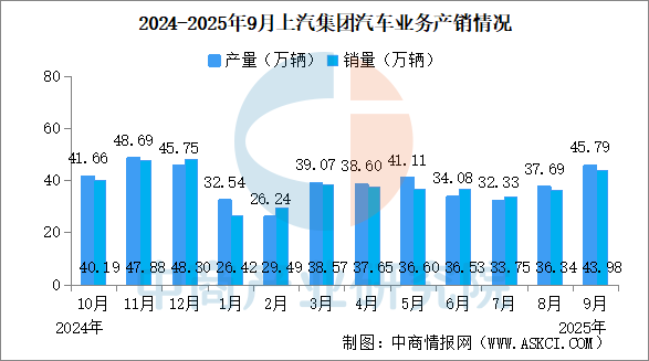 中商情報網(wǎng)訊:9月,上汽集團(tuán)汽車產(chǎn)量45.79萬輛,同比增長35.99%。銷量43.98萬輛,同比增長40.39%。1-9月,上汽集團(tuán)汽車?yán)塾嫯a(chǎn)量329.25萬輛,同比增長24.28%。累計銷量319.33萬輛,同比增長20.53%。