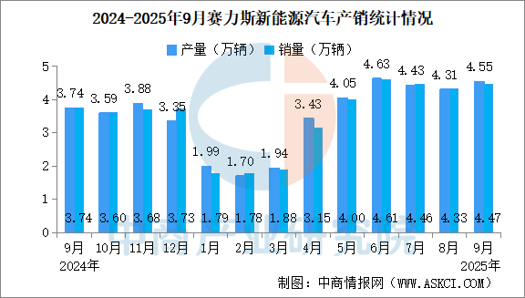 2025年9月,賽力斯新能源汽車4.55萬輛,同比增長21.48%。銷量4.47萬輛,同比增長19.44%。2025年9月,賽力斯新能源汽車產(chǎn)量31.01萬輛,同比減少3.49%。累計銷量30.46萬輛,同比減少3.82%。