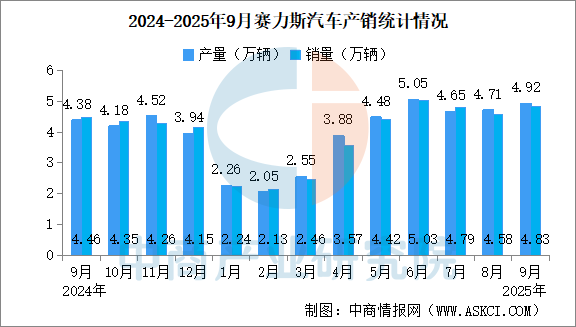中商情報網(wǎng)訊:2025年9月,賽力斯汽車4.92萬輛,同比增長12.51%。銷量4.83萬輛,同比增長8.33%。2025年9月,賽力斯汽車產(chǎn)量34.54萬輛,同比減少6.64%。累計銷量34.07萬輛,同比減少7.79%。