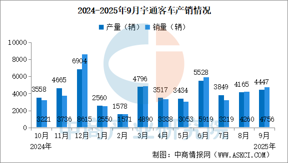 中商情報(bào)網(wǎng)訊:2025年9月,宇通客車產(chǎn)量4447輛,同比增長14.67%。2025年1-9月,宇通客車?yán)塾?jì)產(chǎn)量3.39萬輛,同比增長6.10%。