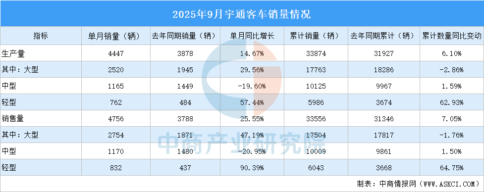 2025年9月,宇通客車銷量4756輛,同比增長25.55%。2025年1-9月,宇通客車?yán)塾?jì)銷量3.36萬輛,同比增長7.05%。