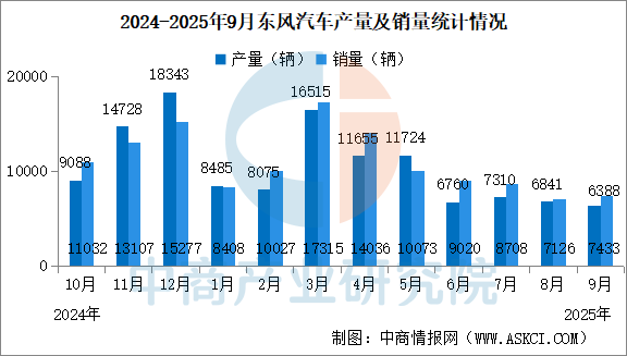 中商情報(bào)網(wǎng)訊:2025年9月,東風(fēng)汽車產(chǎn)量6388輛,同比減少46.50%。銷量7433輛,同比減少42.99%。2025年1-9月,東風(fēng)汽車產(chǎn)量8.38萬(wàn)輛,同比減少23.01。累計(jì)銷量9.21萬(wàn)輛,同比減少20.28。