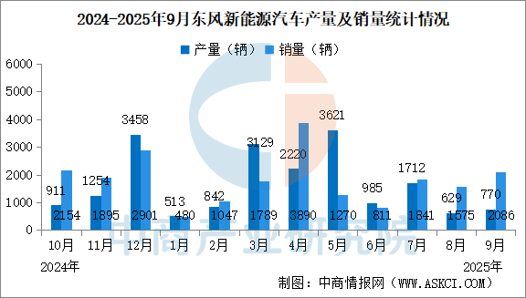 2025年9月,東風(fēng)新能源汽車產(chǎn)量770輛,同比減少24.66%。銷量2086輛,同比增長(zhǎng)87.59%。2025年1-9月,東風(fēng)新能源汽車產(chǎn)量1.44萬(wàn)輛,同比減少25.44。累計(jì)銷量1.48萬(wàn)輛,同比減少16.2。