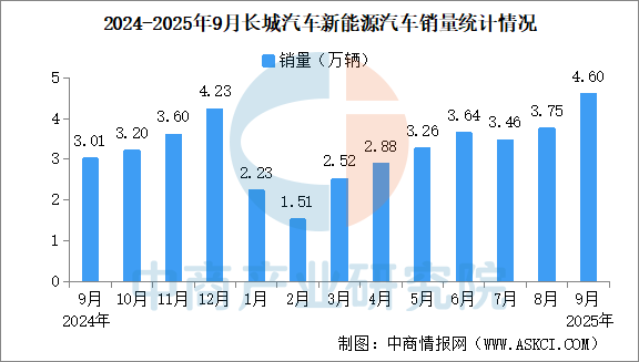 9月長城汽車新能源車銷售4.60萬輛,同比增長52.55%,1-9月累計(jì)銷售27.85萬輛。