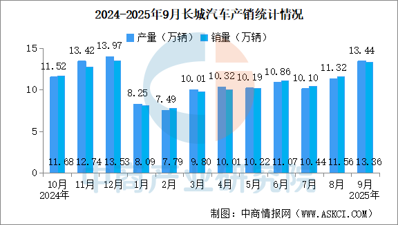 中商情報(bào)網(wǎng)訊:9月,長城汽車產(chǎn)量13.44萬輛,同比增長25.38%。1-9月,長城汽車?yán)塾?jì)產(chǎn)量91.98萬輛,同比增長8.03%。
