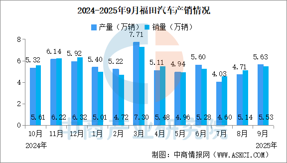 中商情報(bào)網(wǎng)訊:2025年9月,福田汽車產(chǎn)量5.63萬輛,同比減少2.34%。銷量5.53萬輛,同比增長6.08%。2025年1-9月,福田汽車?yán)塾?jì)產(chǎn)量48.33萬輛,同比增長10.55%。累計(jì)銷量48.01萬輛,同比增長10.94%。