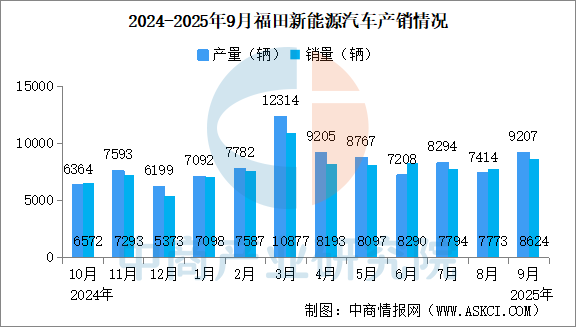 2025年9月,福田新能源汽車產(chǎn)量9207輛,同比增長28.21%。銷量8624輛,同比增長47.77%。2025年1-9月,福田新能源汽車?yán)塾?jì)產(chǎn)量7.73萬輛,同比增長110.97%。累計(jì)銷量7.43萬輛,同比增長113.36%。