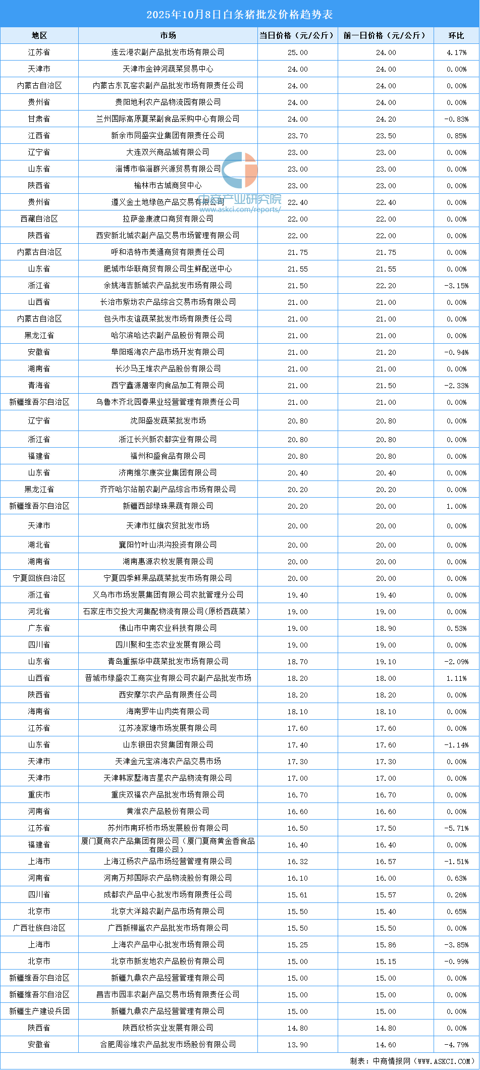 中商情報網訊:最新數據顯示:10月8日全國白條豬平均價格為19.39元/公斤。其中,白條豬價格最高的市場是連云港農副產品批發(fā)市場有限公司,當日價格為25.00元/公斤,環(huán)比上漲4.17%。白條豬價格最低的市場是合肥周谷堆農產品批發(fā)市場股份有限公司,當日價格為13.90元/公斤,環(huán)比下跌4.79%。