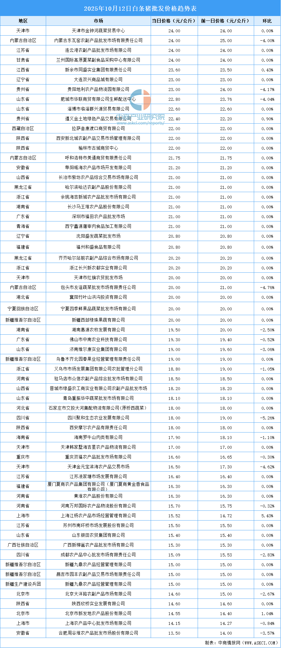 中商情報網(wǎng)訊:最新數(shù)據(jù)顯示:10月12日全國白條豬平均價格為19.04元/公斤。其中,白條豬價格最高的市場是天津市金鐘河蔬菜貿(mào)易中心、內(nèi)蒙古東瓦窯農(nóng)副產(chǎn)品批發(fā)市場有限責任公司、連云港農(nóng)副產(chǎn)品批發(fā)市場有限公司、蘭州國際高原夏菜副食品采購中心有限公司,當日價格均為24.00元/公斤。白條豬價格最低的市場是合肥周谷堆農(nóng)產(chǎn)品批發(fā)市場股份有限公司,當日價格為13.50元/公斤,環(huán)比下跌3.57%。
