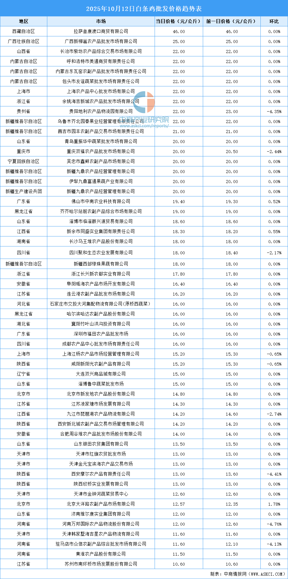 中商情報(bào)網(wǎng)訊:最新數(shù)據(jù)顯示:10月12日全國白條雞平均價(jià)格為17.40元/公斤。其中,白條雞價(jià)格最高的市場(chǎng)是拉薩叁康渡口商貿(mào)有限公司,當(dāng)日價(jià)格為46.00元/公斤,環(huán)比持平。白條雞價(jià)格最低的市場(chǎng)是蘇州市南環(huán)橋市場(chǎng)發(fā)展股份有限公司,當(dāng)日價(jià)格為10.60元/公斤,環(huán)比持平。