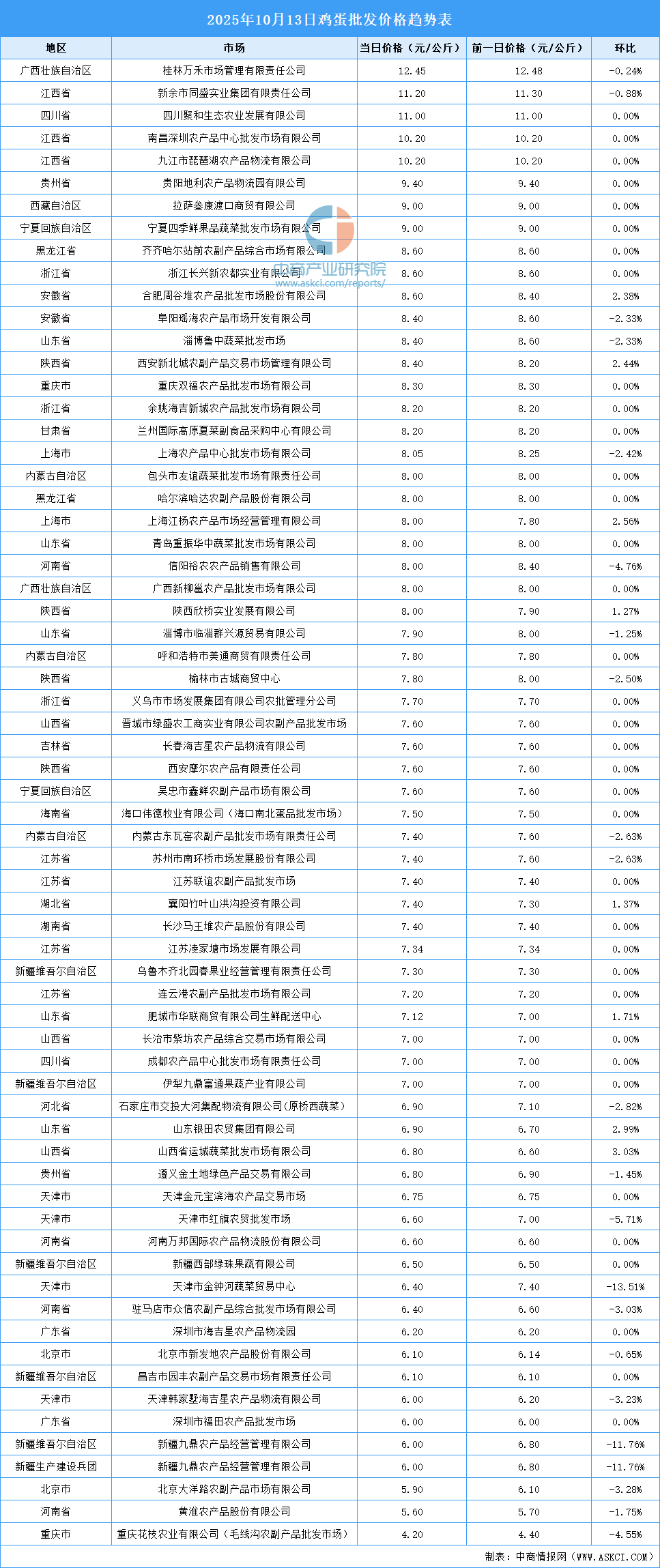 中商情報網(wǎng)訊:最新數(shù)據(jù)顯示:10月13日全國雞蛋平均價格為7.62元/公斤。其中,雞蛋價格最高的市場是桂林萬禾市場管理有限責任公司,當日價格為12.45元/公斤,環(huán)比下跌0.24%。雞蛋價格最低的市場是重慶花枝農(nóng)業(yè)有限公司(毛線溝農(nóng)副產(chǎn)品批發(fā)市場),當日價格為4.20元/公斤,環(huán)比下跌4.55%。