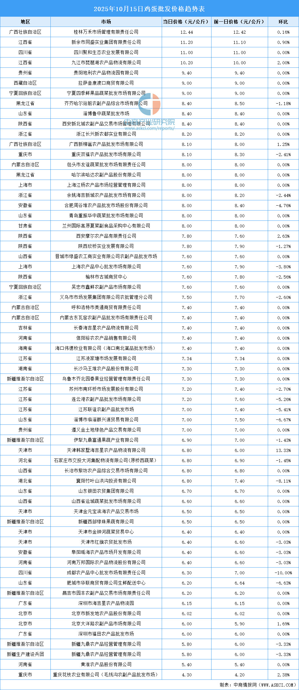 中商情報網訊:最新數(shù)據(jù)顯示:10月15日全國雞蛋平均價格為7.44元/公斤。其中,雞蛋價格最高的市場是桂林萬禾市場管理有限責任公司,當日價格為12.44元/公斤,環(huán)比上漲0.16%。雞蛋價格最低的市場是重慶花枝農業(yè)有限公司(毛線溝農副產品批發(fā)市場),當日價格為4.30元/公斤,環(huán)比上漲2.38%。