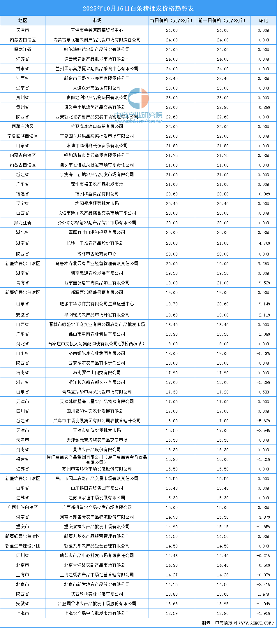 中商情報網(wǎng)訊:最新數(shù)據(jù)顯示:10月16日全國白條豬平均價格為18.59元/公斤。其中,白條豬價格最高的市場是天津市金鐘河蔬菜貿(mào)易中心、內(nèi)蒙古東瓦窯農(nóng)副產(chǎn)品批發(fā)市場有限責(zé)任公司、哈爾濱哈達農(nóng)副產(chǎn)品股份有限公司、連云港農(nóng)副產(chǎn)品批發(fā)市場有限公司、蘭州國際高原夏菜副食品采購中心有限公司,當(dāng)日價格均為24.00元/公斤。白條豬價格最低的上海農(nóng)產(chǎn)品中心批發(fā)市場有限公司,當(dāng)日價格為13.59元/公斤,環(huán)比下跌1.95%。