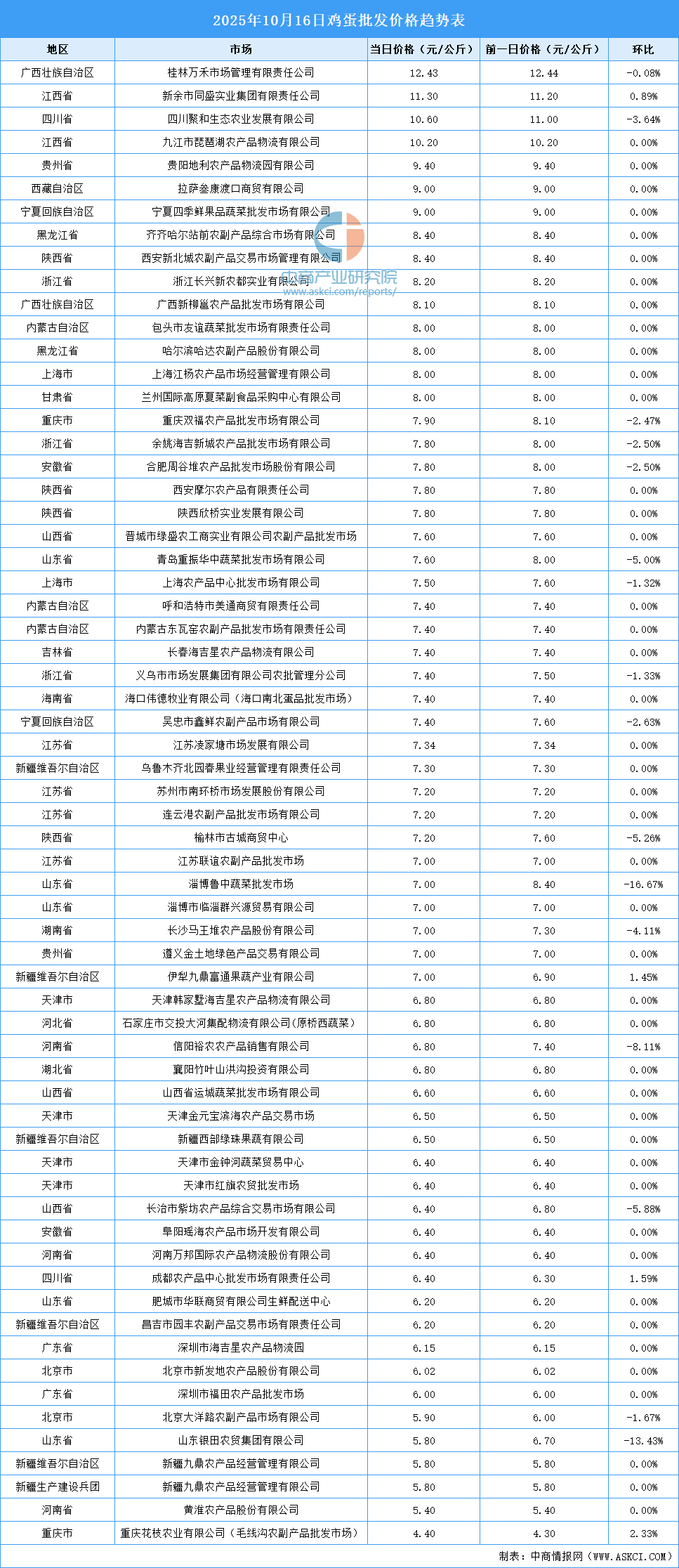 中商情報(bào)網(wǎng)訊:最新數(shù)據(jù)顯示:10月16日全國雞蛋平均價(jià)格為7.35元/公斤。其中,雞蛋價(jià)格最高的市場是桂林萬禾市場管理有限責(zé)任公司,當(dāng)日價(jià)格為12.43元/公斤,環(huán)比下跌0.08%。雞蛋價(jià)格最低的市場是重慶花枝農(nóng)業(yè)有限公司(毛線溝農(nóng)副產(chǎn)品批發(fā)市場),當(dāng)日價(jià)格為4.40元/公斤,環(huán)比上漲2.33%。