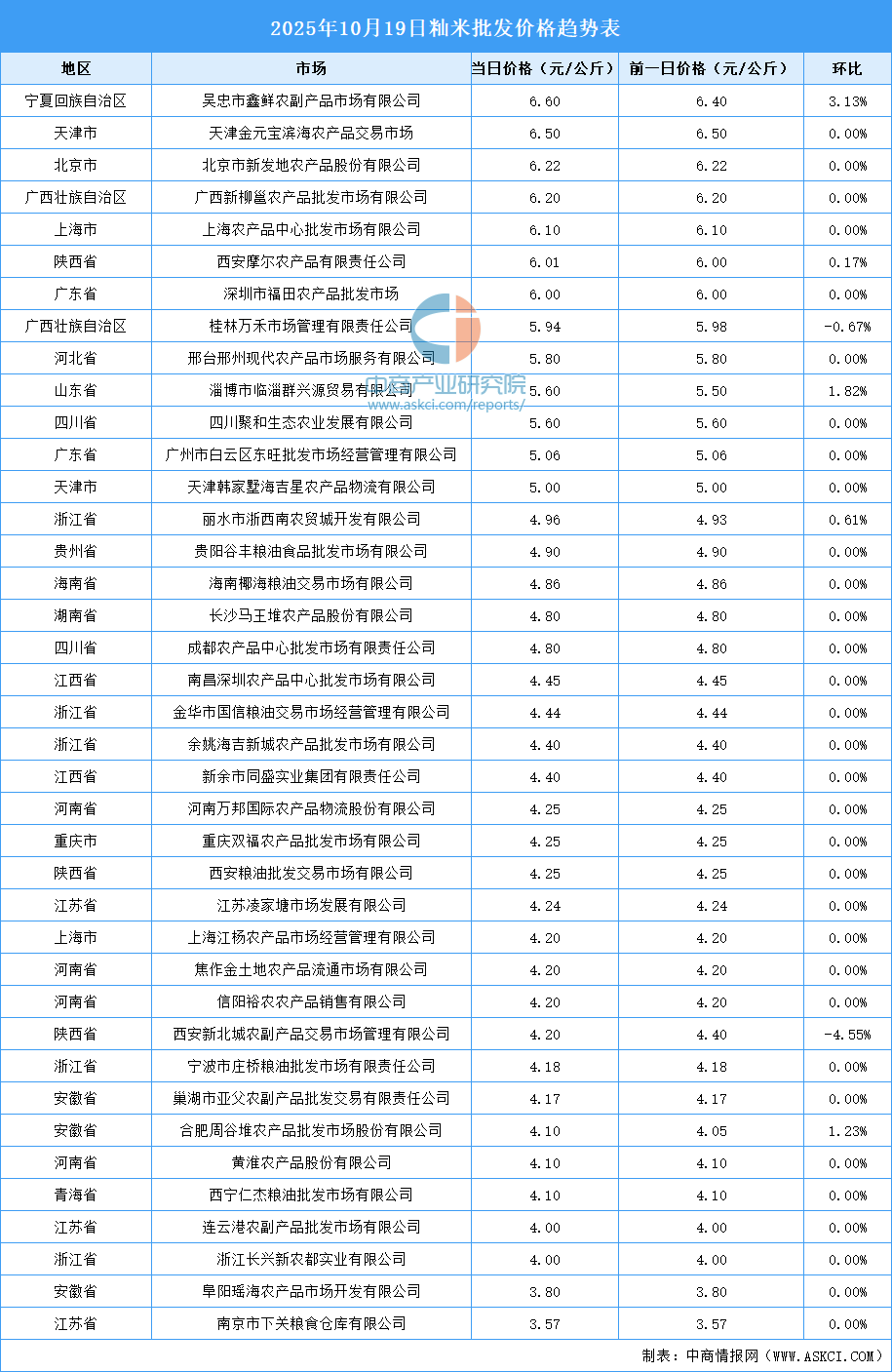 中商情報(bào)網(wǎng)訊:最新數(shù)據(jù)顯示:10月19日,全國(guó)粳米當(dāng)日均價(jià)為5.23元/公斤,秈米當(dāng)日均價(jià)為4.83元/公斤。其中,粳米價(jià)格最高的遵義金土地綠色產(chǎn)品交易有限公司,當(dāng)日價(jià)格為7.90元/公斤,環(huán)比上漲1.28%。秈米價(jià)格最高的市場(chǎng)是吳忠市鑫鮮農(nóng)副產(chǎn)品市場(chǎng)有限公司,當(dāng)日價(jià)格為6.60元/公斤,環(huán)比上漲3.13%。以下是2025年10月19日全國(guó)大米價(jià)格趨勢(shì)表詳情: