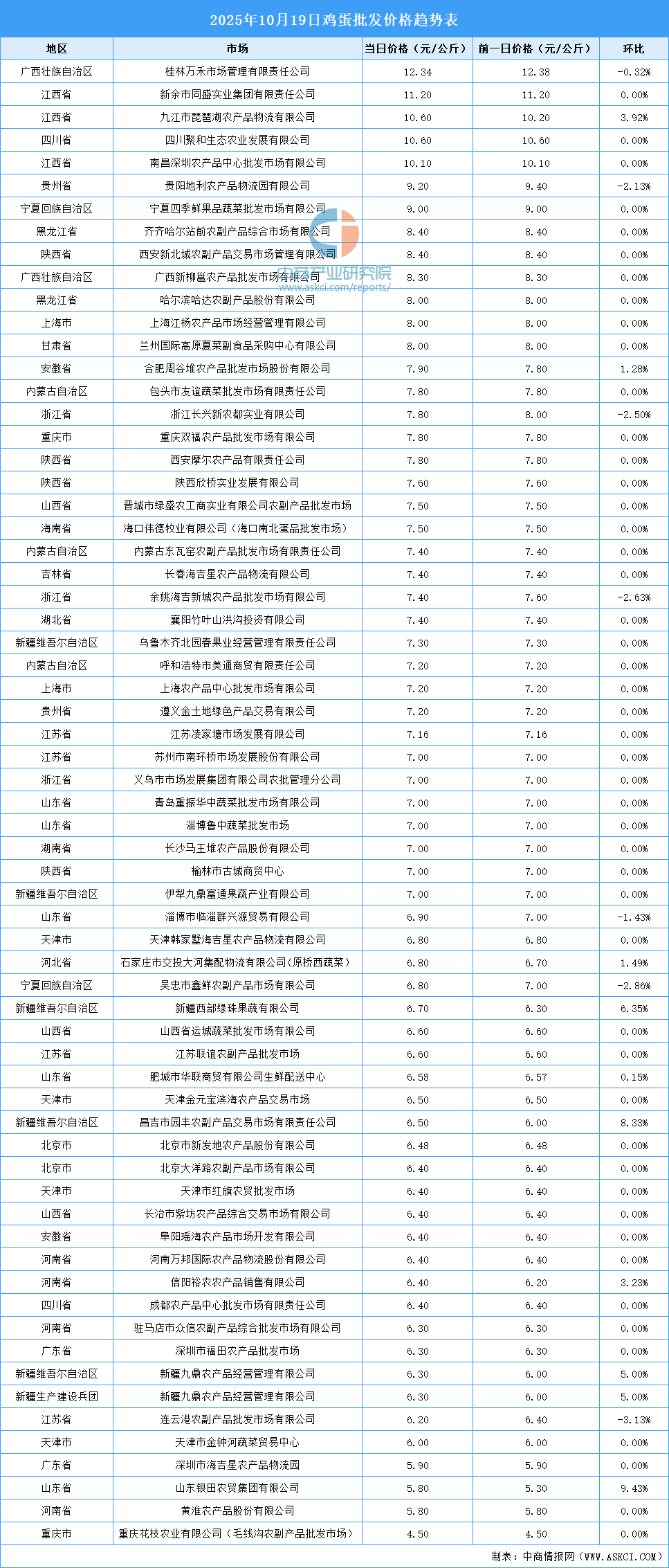 中商情報網(wǎng)訊:最新數(shù)據(jù)顯示:10月19日全國雞蛋平均價格為7.32元/公斤。其中,雞蛋價格最高的市場是桂林萬禾市場管理有限責(zé)任公司,當日價格為12.34元/公斤,環(huán)比下跌0.32%。雞蛋價格最低的市場是重慶花枝農(nóng)業(yè)有限公司(毛線溝農(nóng)副產(chǎn)品批發(fā)市場),當日價格為4.50元/公斤,環(huán)比持平。